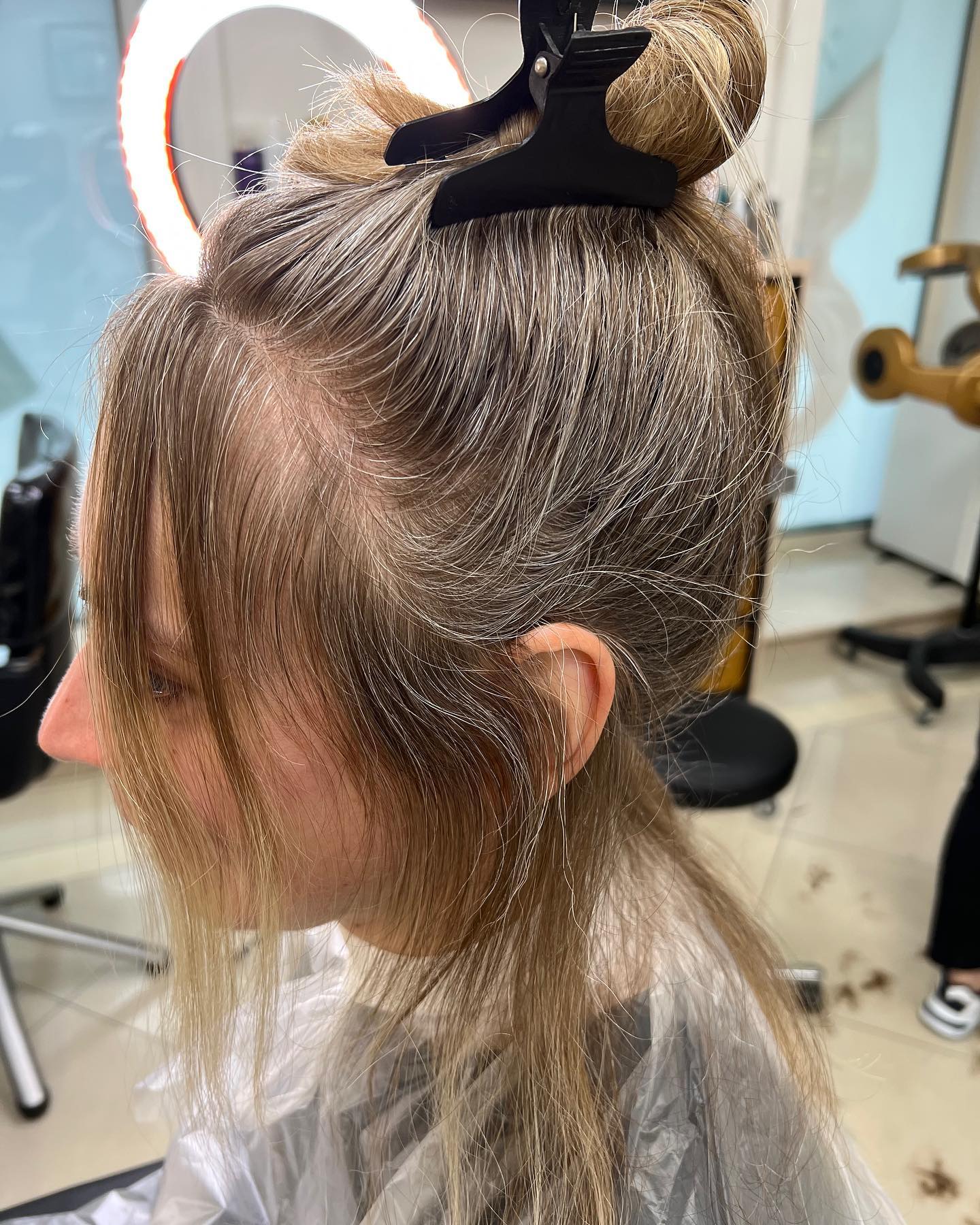 Обесцвечиваются только тонкие, мягкие волосы, которые растут вдоль линии роста волос на лбу (baby hair) и корни передних прядей волос. Максимальное осветление проводится возле лица, а на остальных волосах идет растяжка цвета.